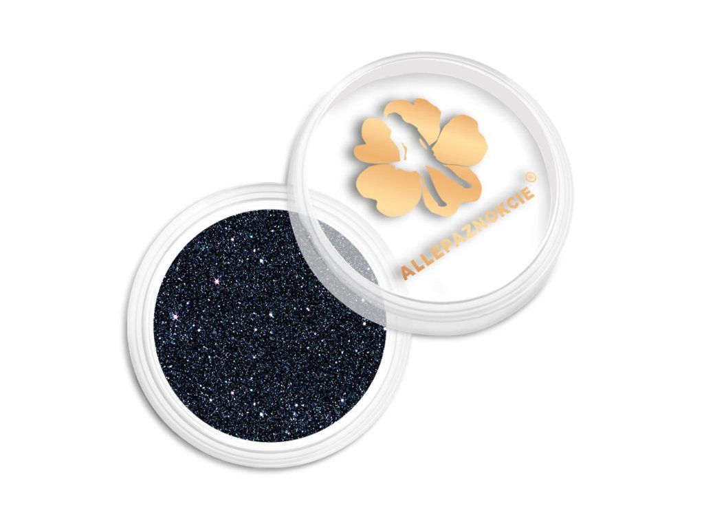 Třpytky na nehty v krásné modro-černé barvě. Šroubovací uzávěr. Možné aplikovat do laku i UV gelu. Možné použít i na zdobení těla nebo vlasů.