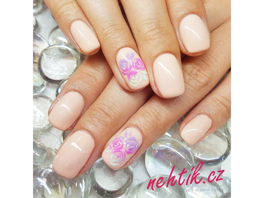 Na připravené nehty s vrchním top gelem nanášíme gel tenkým zdobícím štětečkem. Na gel nasypeme barevný akryl a tvoříme zdobení. Vytvrzujeme v UV lampě 3 min. v LED 30 sek.